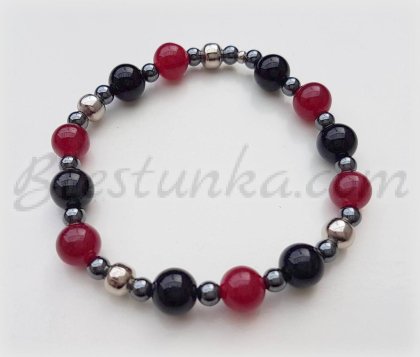 Bracelet "Red and black"- semiprecious stone beads of agate, sizes 8 mm, hematite 4 mm, strung on elastic cord, with metal decoration elements.