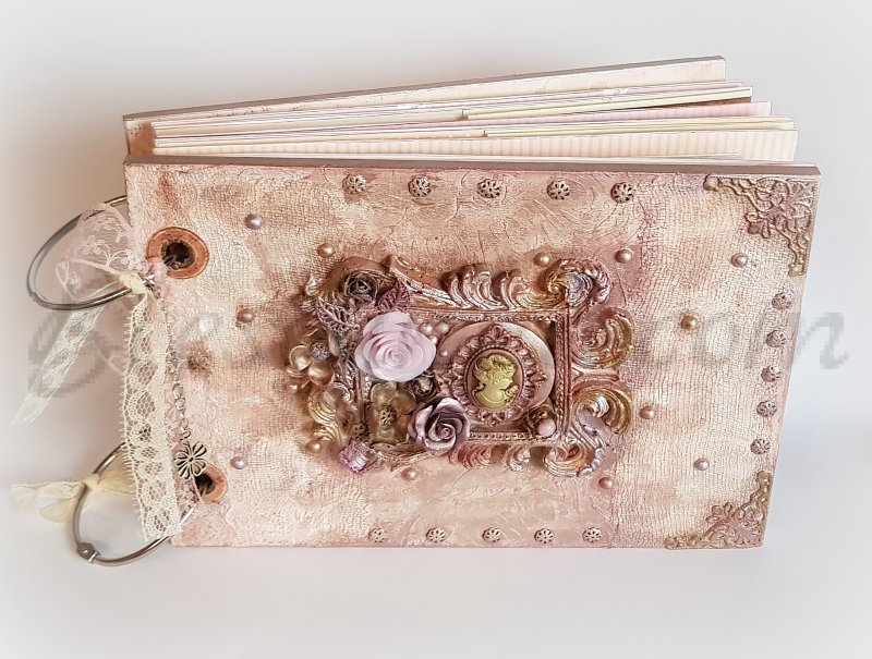 Álbum "Esplendor": un álbum original y hecho a mano con cubiertas de madera. El acento en la cubierta frontal del álbum es un marco bonito con camafeo, adornado con un ramo de rosas y pequeñas flores modeladas a mano de arcilla polimérica. En la decoración se ha utilizado la técnica de mix media, que incluye el uso de distintos elementos de papel, metal, textil, encaje, pinturas acrílicas y pastas con efectos especiales.
