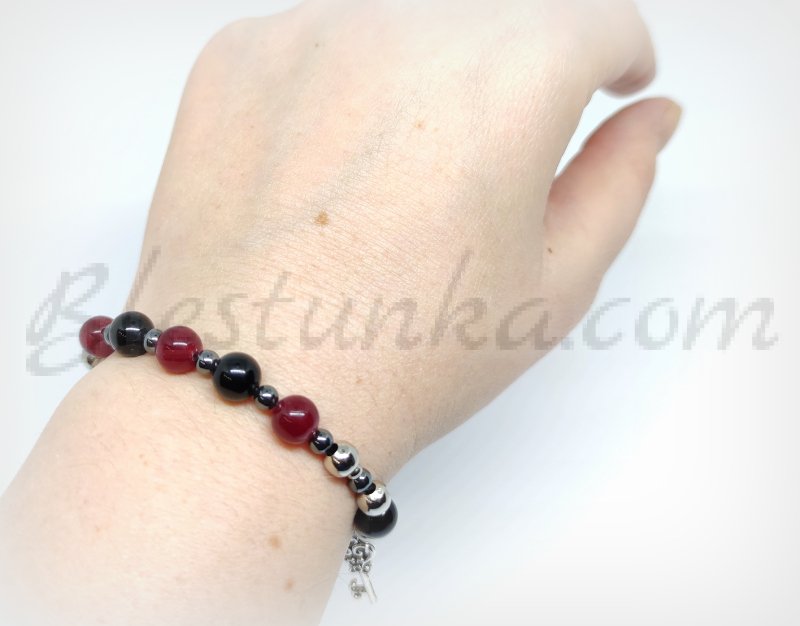 Гривна "Любов" - мъниста полускъпоценен камък ахат, размер 8 мм, хематит с размер 4 мм, нанизани на стоманена тел, метални елементи за декорация.